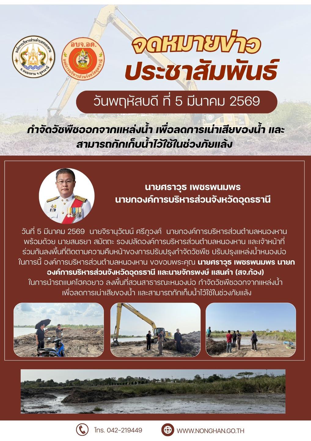 ขอขอบพระคุณ นายศราวุธ เพชรพนมพร นายกองค์การบริหารส่วนจังหวัดอุดรธานี และนายจักรพงษ์ แสนคำ (สจ.ก้อง) ในการนำรถแบคโฮคอยาว ลงพื้นที่สวนสาธารณะหนองบ่อ กำจัดวัชพืชออกจากแหล่งน้ำ เพื่อลดการเน่าเสียของน้ำ และสามารถกักเก็บน้ำไว้ใช้ในช่วงภัยแล้ง |