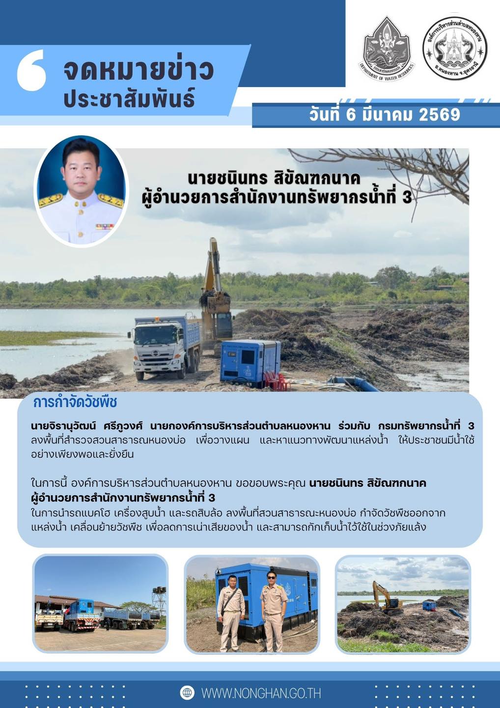 องค์การบริหารส่วนตำบลหนองหาน ขอขอบพระคุณ นายชนินทร สิขัณฑกนาค ผู้อำนวยการสำนักงานทรัพยากรน้ำที่ 3 ในการนำรถแบคโฮ เครื่องสูบน้ำ และรถสิบล้อ ลงพื้นที่สวนสาธารณะหนองบ่อ กำจัดวัชพืชออกจาก แหล่งน้ำ เคลื่อนย้ายวัชพืช เพื่อลดการเน่าเสียของน้ำ และสามารถกักเก็บ |