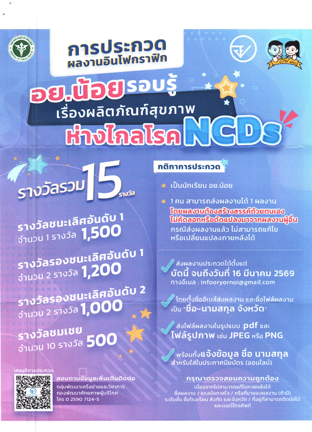 ประชาสัมพันธ์เชิญชวนนักเรียนร่วมส่งผลงานสื่ออินโฟกราฟิกประกวดในหัวข้อ "อย.น้อย รอบรู้เรื่องผลิตภัณฑ์สุขภาพห่างไกลโรค NCDs" ประจำปี พ.ศ.2569 |