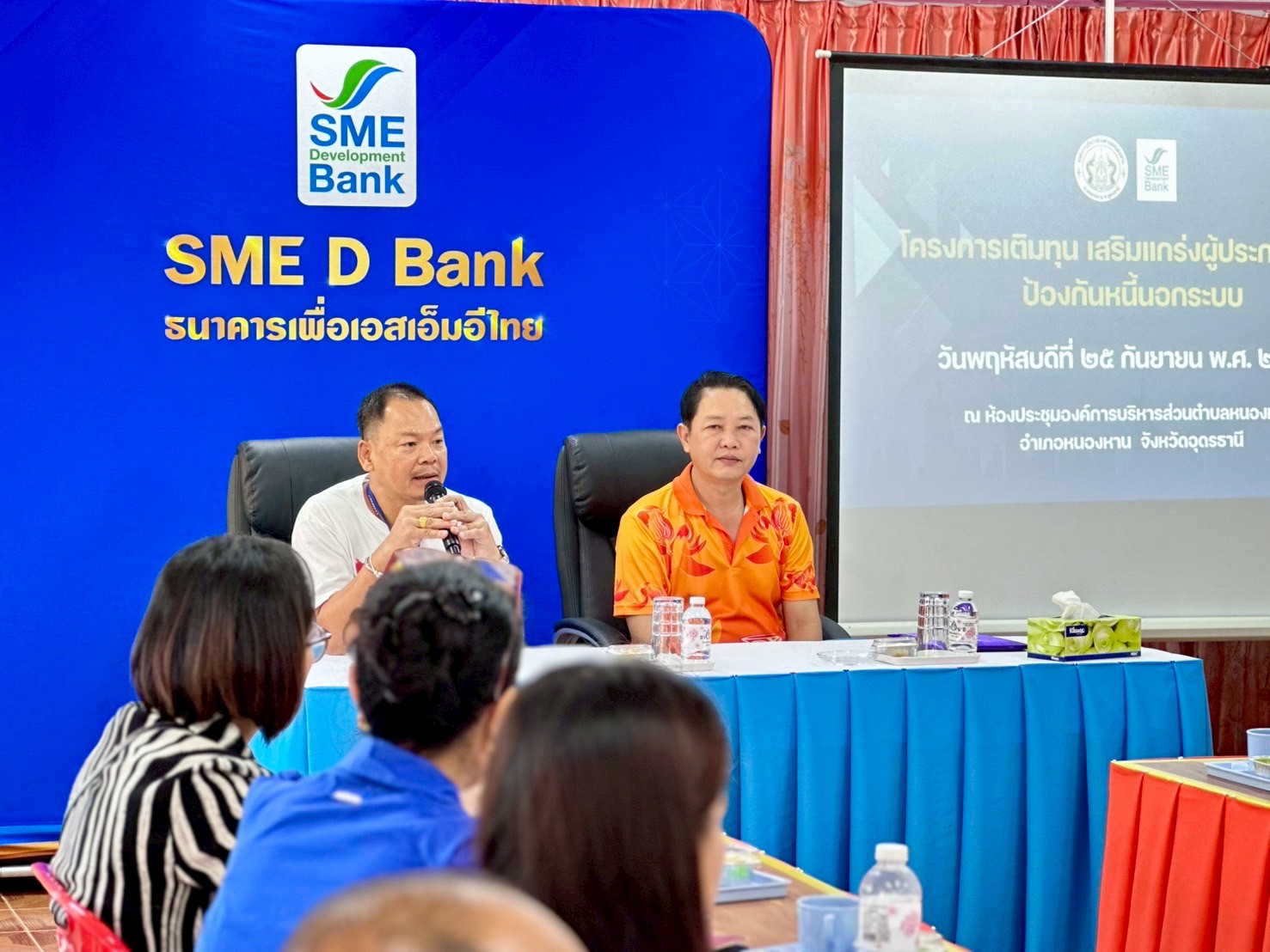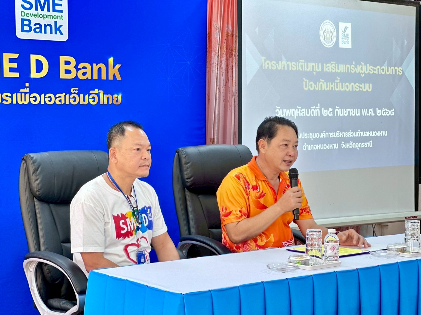 วันพฤหัสบดีที่ 25 กันยายน 2568 องค์การบริหารส่วนตำบลหนองหาน นำโดย นายจิรานุวัฒน์ ศรีภูวงศ์ นายกองค์การบริหารส่วนตำบลหนองหาน ร่วมกับ ธนาคารพัฒนาวิสาหกิจขนาดกลางและขนาดย่อมแห่งประเทศไทย (SME D Bank) สาขาอุดรธานี จัดโครงการเติมทุน เสริมแกร่งผู้ประกอบการ ป้องกันหนี้นอกระบบขึ้น ณ ห้องประชุมองค์การบริหารส่วนตำบลหนองหาน อำเภอหนองหาน จังหวัดอุดรธานี