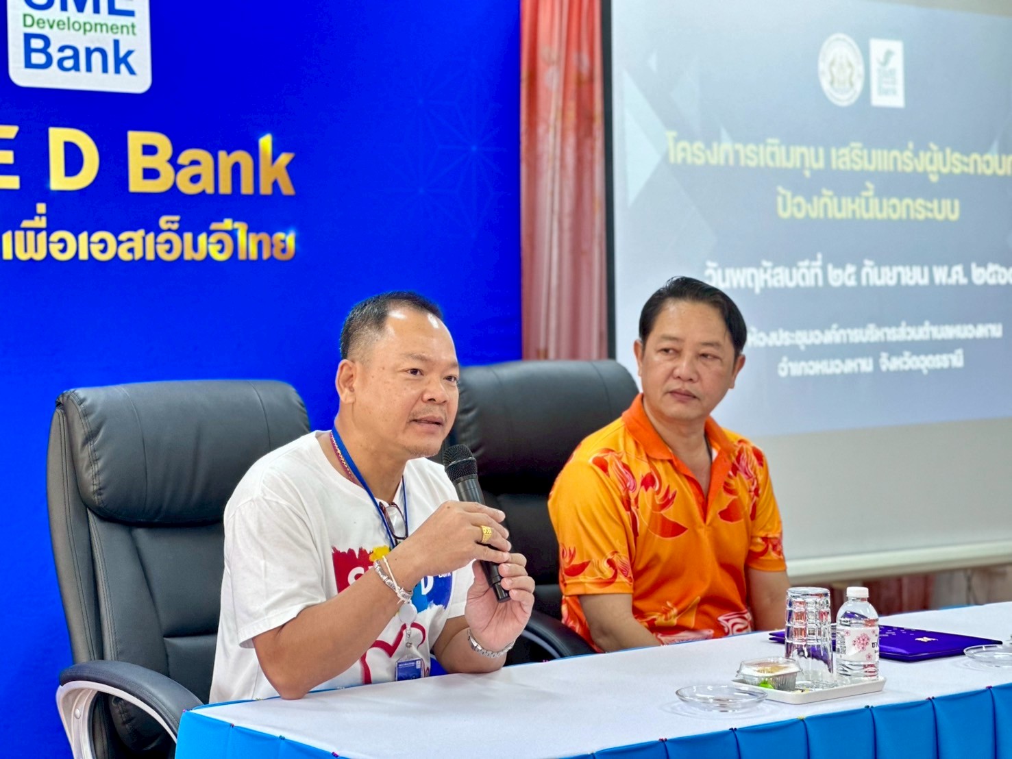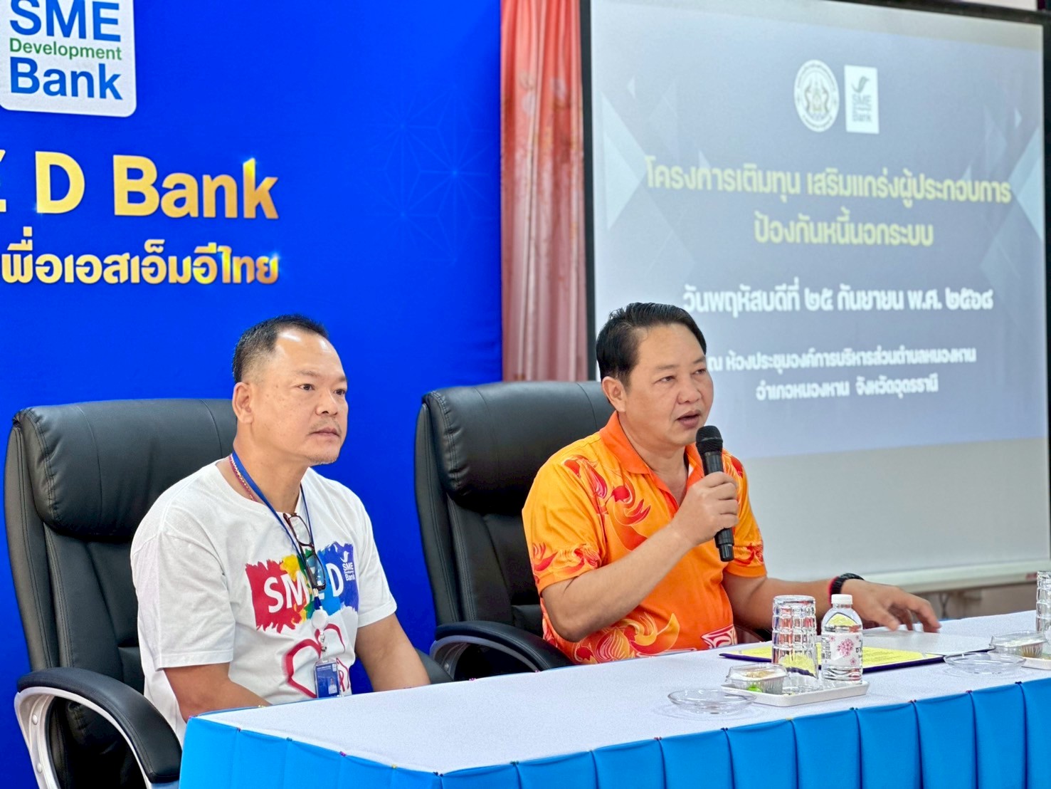 วันพฤหัสบดีที่ 25 กันยายน 2568 องค์การบริหารส่วนตำบลหนองหาน นำโดย นายจิรานุวัฒน์ ศรีภูวงศ์ นายกองค์การบริหารส่วนตำบลหนองหาน ร่วมกับ ธนาคารพัฒนาวิสาหกิจขนาดกลางและขนาดย่อมแห่งประเทศไทย (SME D Bank) สาขาอุดรธานี จัดโครงการเติมทุน เสริมแกร่งผู้ประกอบการ ป้องกันหนี้นอกระบบขึ้น ณ ห้องประชุมองค์การบริหารส่วนตำบลหนองหาน อำเภอหนองหาน จังหวัดอุดรธานี